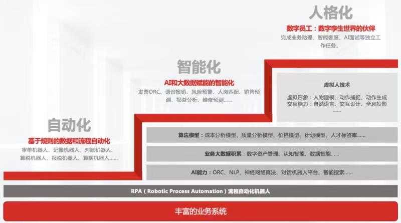 不同于閱讀、聊天、搜索等面向終端用戶的應(yīng)用場(chǎng)景,人工智能在企業(yè)級(jí)領(lǐng)域的應(yīng)用更具復(fù)雜性。在這一過程中,從早期依托RPA技術(shù)實(shí)現(xiàn)基于規(guī)則的數(shù)據(jù)和流程自動(dòng)化,到借助OCR、NLP、算法模型等實(shí)現(xiàn)AI和大數(shù)據(jù)賦能的智能化,再到基于虛擬人技術(shù)的數(shù)智員工的誕生,AI技術(shù)在企業(yè)領(lǐng)域的應(yīng)用歷經(jīng)自動(dòng)化、智能化、人格化的發(fā)展過程。