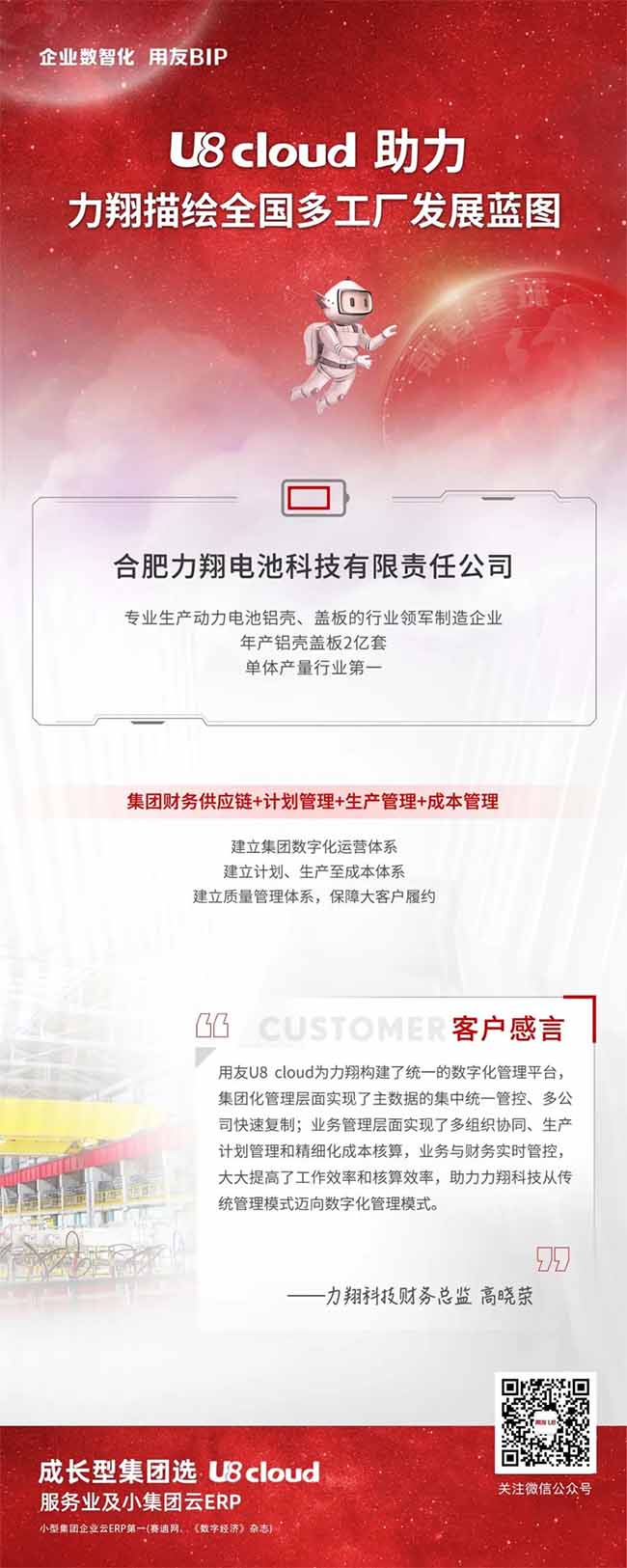 力翔科技是新能源電池外殼領(lǐng)域快速發(fā)展的企業(yè),通過用友 U8 cloud完成數(shù)智化轉(zhuǎn)型,實現(xiàn)集團(tuán)主數(shù)據(jù)統(tǒng)一管理、規(guī)范七大管理流程、滿足 IPO審計要求,實現(xiàn)全國多工廠快速復(fù)制擴(kuò)張。
