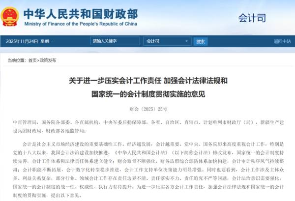近日,財(cái)政部《關(guān)于進(jìn)一步壓實(shí)會(huì)計(jì)工作責(zé)任 加強(qiáng)會(huì)計(jì)法律法規(guī)和國(guó)家統(tǒng)一的會(huì)計(jì)制度貫徹實(shí)施的意見》(財(cái)會(huì)〔2025〕25號(hào))正式落地。新規(guī)進(jìn)一步明確會(huì)計(jì)責(zé)任主體、強(qiáng)化數(shù)據(jù)合規(guī)要求,推動(dòng)企業(yè)從“被動(dòng)合規(guī)”向“主動(dòng)提效”轉(zhuǎn)變。