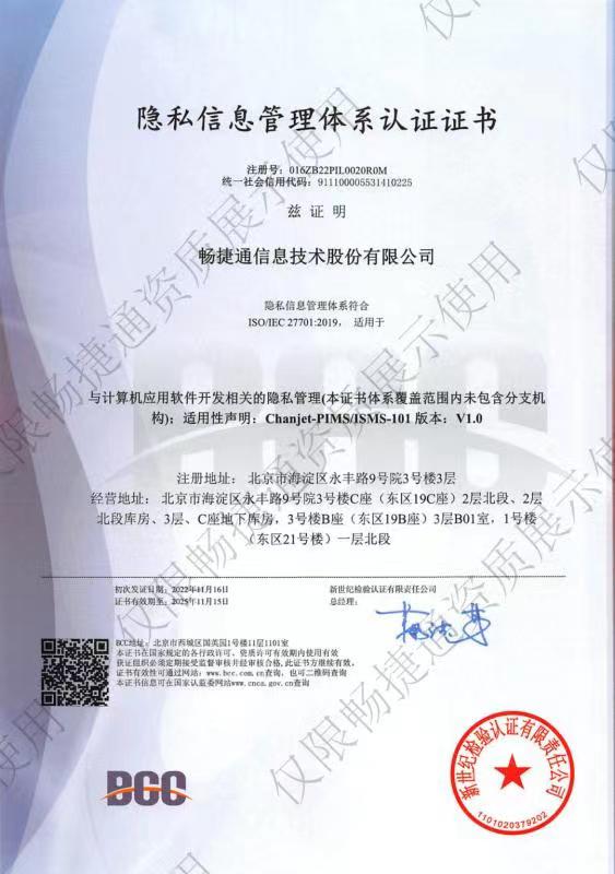 ISO27701是國際標準化組織(ISO)和國際電?工委員會(IEC)聯(lián)合發(fā)布的隱私信息管理體系國際標準,它是對ISO27001信息安全管理體系的擴展。ISO27701不僅是一個管理體系,還是一個通用的信息安全控制措施集合,在14個控制域里提出了35個安全控制目標和114個控制措施,全面保障公司的信息安全。用友暢捷通已于2021年就通過了ISO27001資質認證。