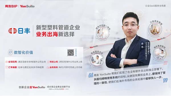 日豐集團(tuán)自1996年成立以來,在管道產(chǎn)品領(lǐng)域深耕二十余載,為億萬家庭提供全屋管道系統(tǒng)解決方案。隨著品牌走向國際,其在海外業(yè)務(wù)運營協(xié)同和管理上面臨諸多挑戰(zhàn)。在此背景下,日豐選擇用友YonSuite作為海外拓展的數(shù)智化伙伴,取得了顯著成效:實現(xiàn)了更高效管理,極大提升了財務(wù)的工作效率和全球的協(xié)同效率,有力推動企業(yè)在全球業(yè)務(wù)的拓展。