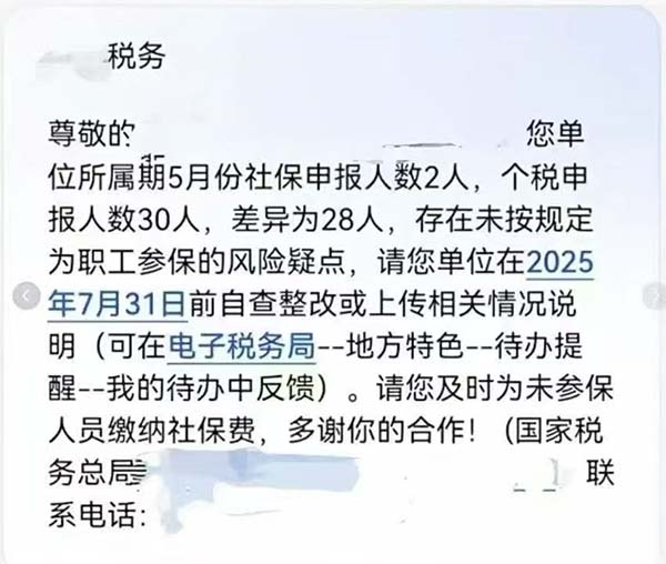 您單位所屬期5月份社保申報(bào)人數(shù)2人,個(gè)稅申報(bào)人數(shù)30人,差異28人,存在未按規(guī)定為職工參保的風(fēng)險(xiǎn)疑點(diǎn),請(qǐng)您單位在2025年7月31日前自查整改或上傳相關(guān)情況說明。請(qǐng)您及時(shí)為參保人員繳納社保費(fèi),多謝你的合作!”
