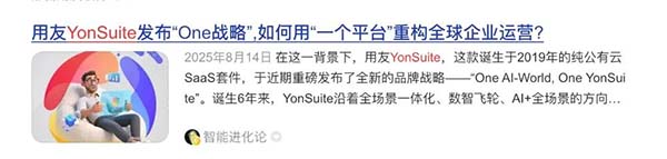 它提出的“雙One”,既是對未來的宏大描繪,也是對自身角色的精準(zhǔn)定位:One AI-World,勾勒AI驅(qū)動的新商業(yè)世界;One YonSuite,宣示成為全球成長型企業(yè)最優(yōu)核心平臺的決心,也意味著一次 All-in-ONE 的戰(zhàn)略升級。