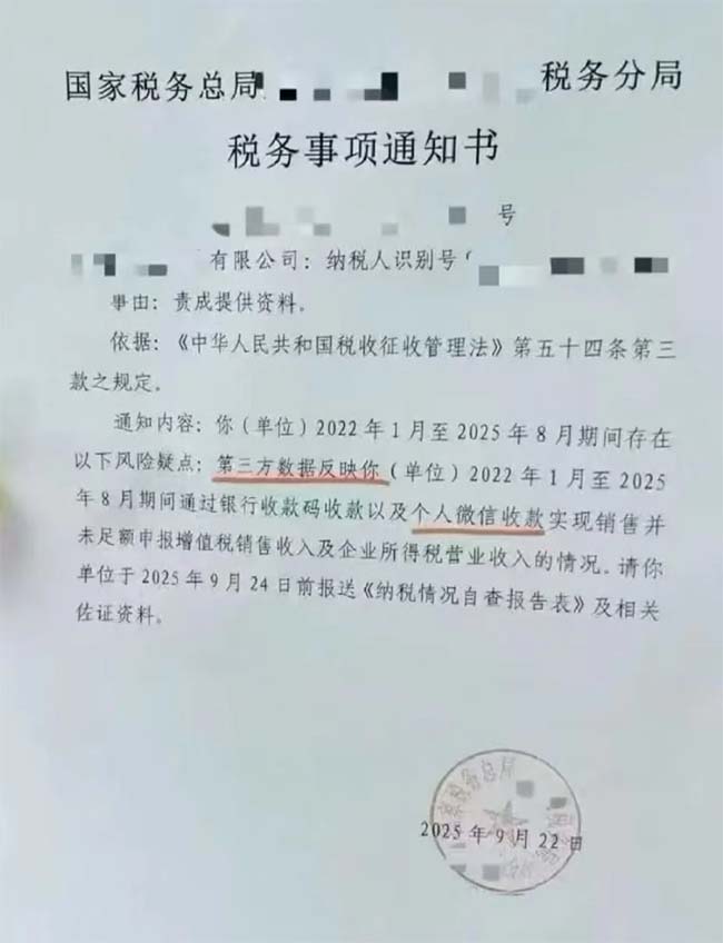 經(jīng)查,該公司于2021年至2023年4月30日通過1325372XXXX、1813755XXXX、1753740XXXX、1355490XXXX等24個(gè)私人微信賬號(hào)收取公司相關(guān)貨款,稅務(wù)局責(zé)成該公司提供通過以上微信賬戶收款的相關(guān)貨款審計(jì)的出庫單據(jù)、銀行收款證明及相關(guān)賬冊(cè)資料。