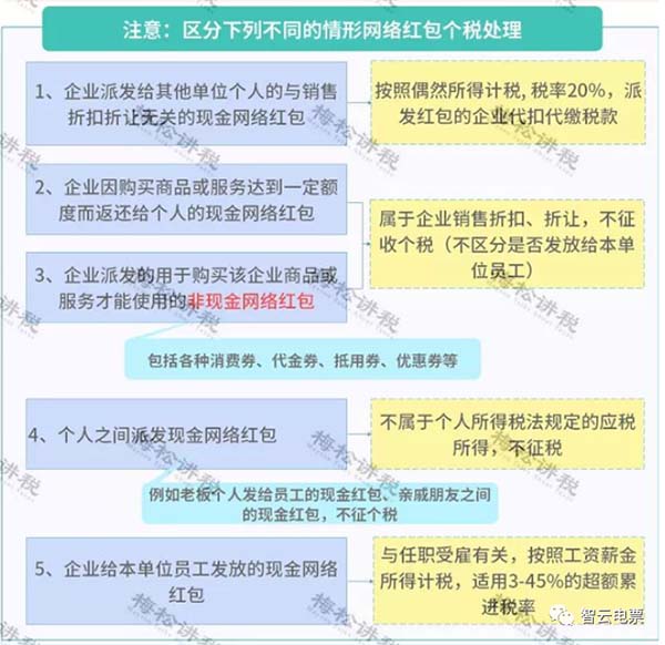 注意:微信、支付寶發(fā)紅包有時(shí)也要繳納個(gè)稅,區(qū)分下列不同的情形網(wǎng)絡(luò)紅包個(gè)稅處理,具體如下: