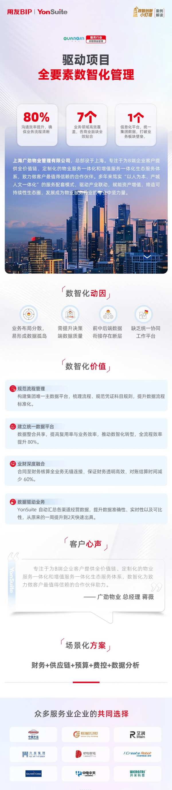 上海廣勁物業(yè)管理有限公司財(cái)務(wù)總蔣薇說(shuō):“我們一直專注給 B 端企業(yè)客戶,打造全流程、定制化的物業(yè)服務(wù)和增值服務(wù)生態(tài)。這次和用友 YonSuite 合作搞數(shù)智化,就是想成為客戶最靠譜的伙伴。” 從蔣薇這番話能看出來(lái),廣勁物業(yè)下定決心,要用數(shù)智化升級(jí)物業(yè)服務(wù)。事實(shí)證明,這次轉(zhuǎn)型特別成功,不僅解決了數(shù)據(jù)不通、流程卡殼的老問(wèn)題,還搭建起一套完整的項(xiàng)目數(shù)智化管理體系,給以后提升服務(wù)、拓展業(yè)務(wù)打下了堅(jiān)實(shí)基礎(chǔ)。