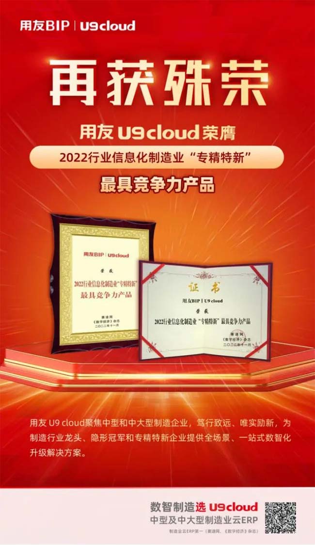 憑借在眾多制造企業(yè)的成功應(yīng)用,用友U9 cloud先后榮獲2022年中國(guó)制造業(yè)云ERP狀元獎(jiǎng)、2022行業(yè)信息化制造業(yè)“專精特新”最具競(jìng)爭(zhēng)力產(chǎn)品、2022新基建中型及中大型制造業(yè)云ERP首選品牌等一系列獎(jiǎng)項(xiàng),成為制造企業(yè)數(shù)智化轉(zhuǎn)型的首選品牌。