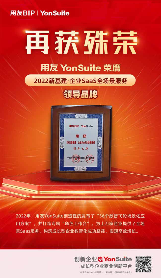 本次評(píng)選用友YonSuite榮獲“2022新基建·企業(yè)SaaS全場(chǎng)景服務(wù)領(lǐng)導(dǎo)品牌”,以實(shí)力引領(lǐng)創(chuàng)新,以技術(shù)領(lǐng)先性和創(chuàng)新性驅(qū)動(dòng)企業(yè)高效增長,領(lǐng)跑中國SaaS產(chǎn)業(yè)發(fā)展。